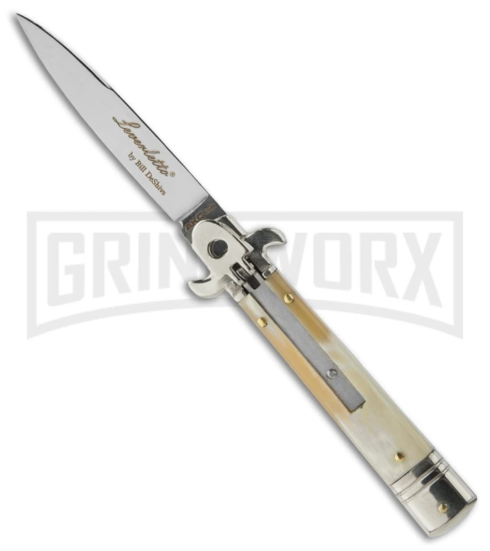 AKC 7.75″ Bill DeShivs Leverletto Honey Horn Automatic Knife – Flat Grind