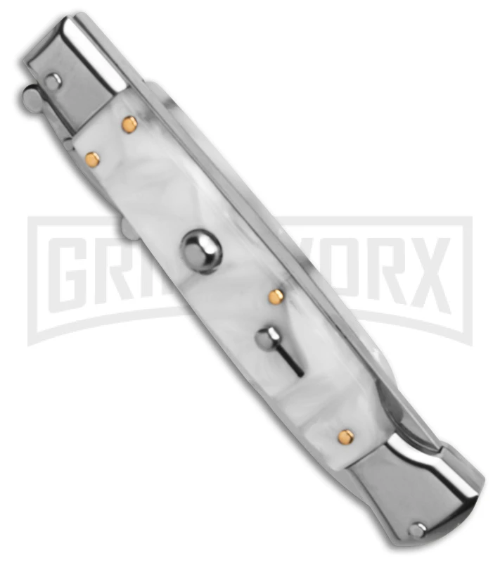 This blade boasts white pearlex scales over stainless steel frames and liners.