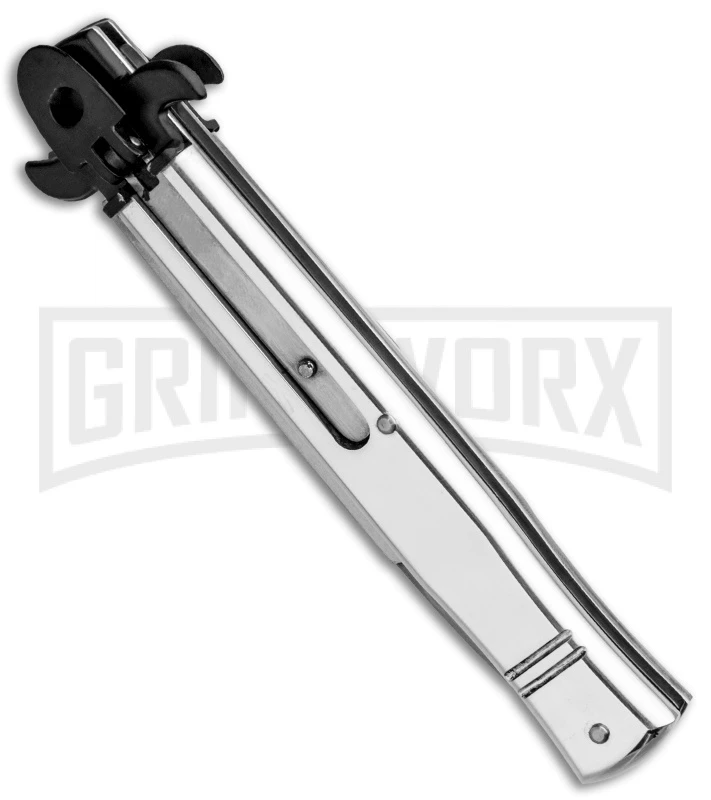 AKC 9″ Tactical Leverletto Polished Silver Automatic Knife – Satin Flat Grind