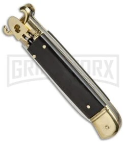 This mini version of the classic style lever lock knife from AKC of Italy is an excellent little piece. Beautiful workmanship & style. Press the lever down and the knife opens automatically! Polished stainless steel blades. With beautiful, dark horn handle scales and sturdy, stainless steel liners, this knife will last and last. Blade tang stamped “AKC Italy” to verify the authenticity.